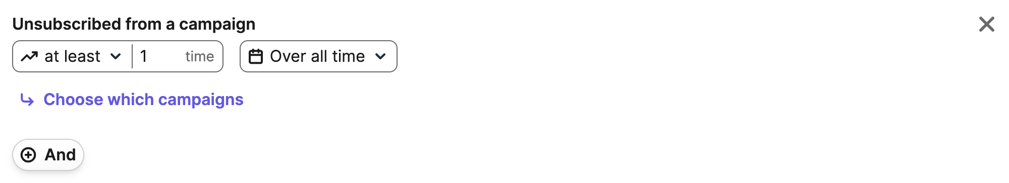Wählen Sie im Dropdown-Menü Email > Unsubscribed from emails > Email campaign (E-Mail > Von E-Mails abgemeldet > E-Mail-Kampagne). Sie können dann die Anzahl der Abmeldungen oder den Zeitraum angeben, in dem sie sich abgemeldet haben, sowie bestimmte Kampagnennamen oder Tags.