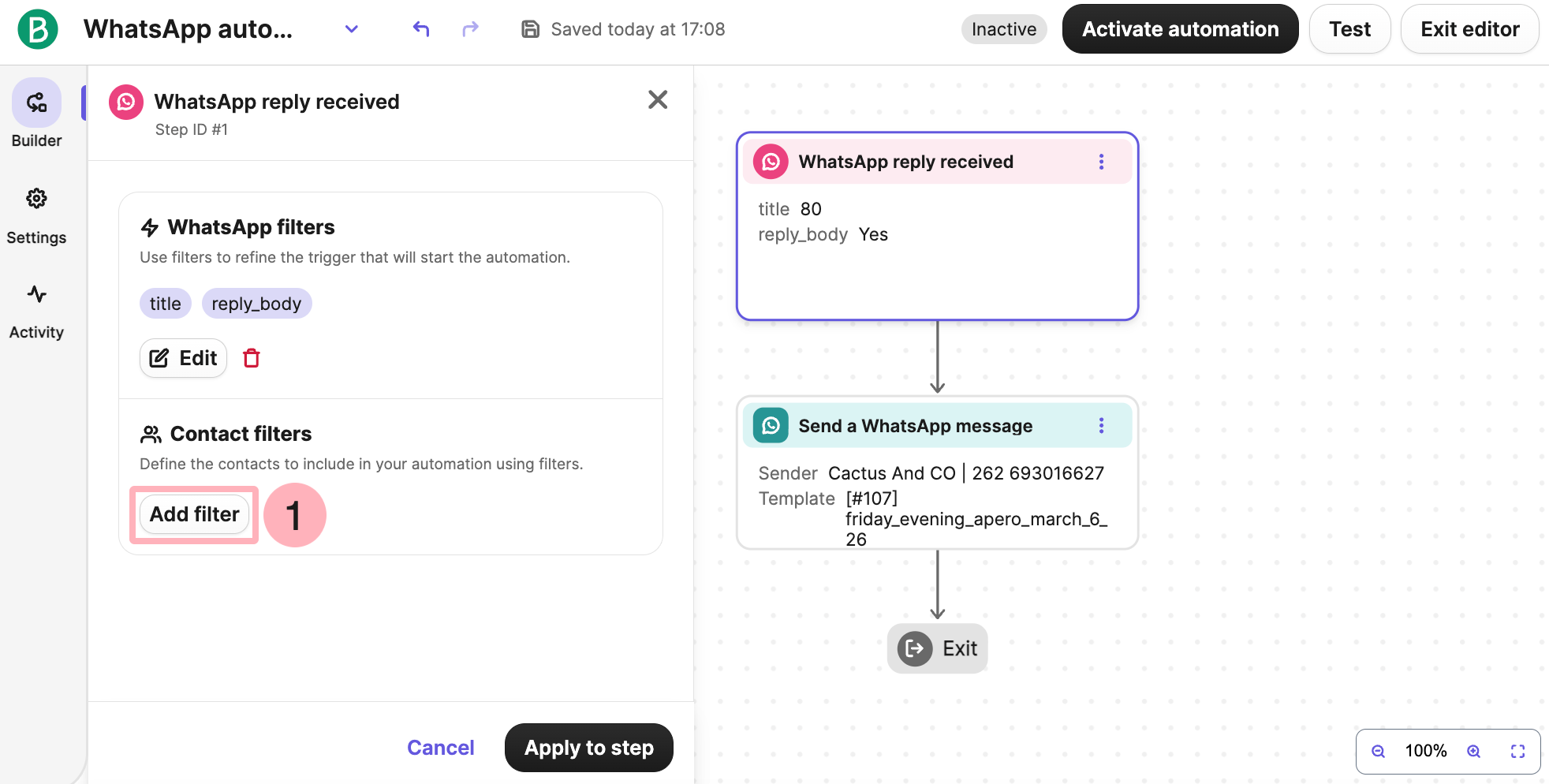 Your automation is now active. Contacts will enter it when they rely to a WhatsApp campaign and they meet your selected filters. They will then receive an automatic reply. If they do not meet the selected filters, they will simply not receive anything.