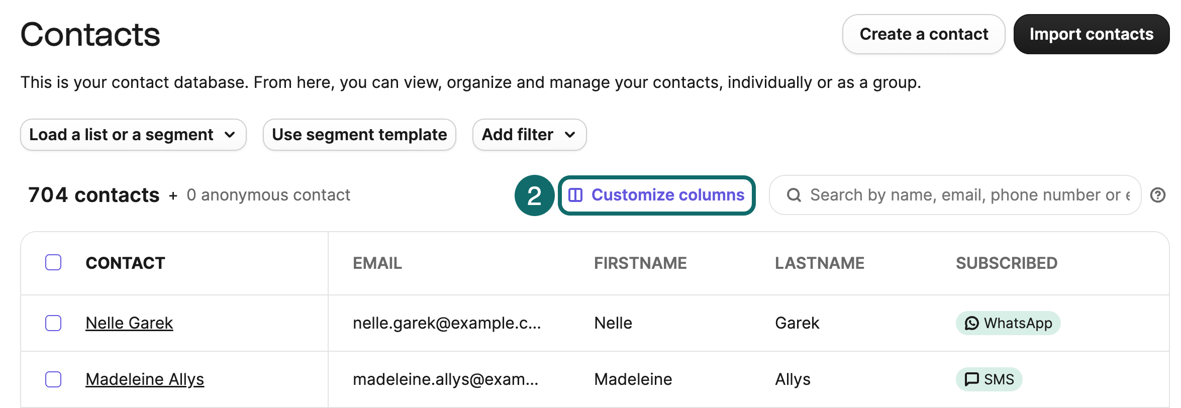 The Contacts page displays a table listing your contacts. Each column represents a contact attribute, providing information about your contacts. You can customize and rearrange these columns to display the specific attributes you are interested in.