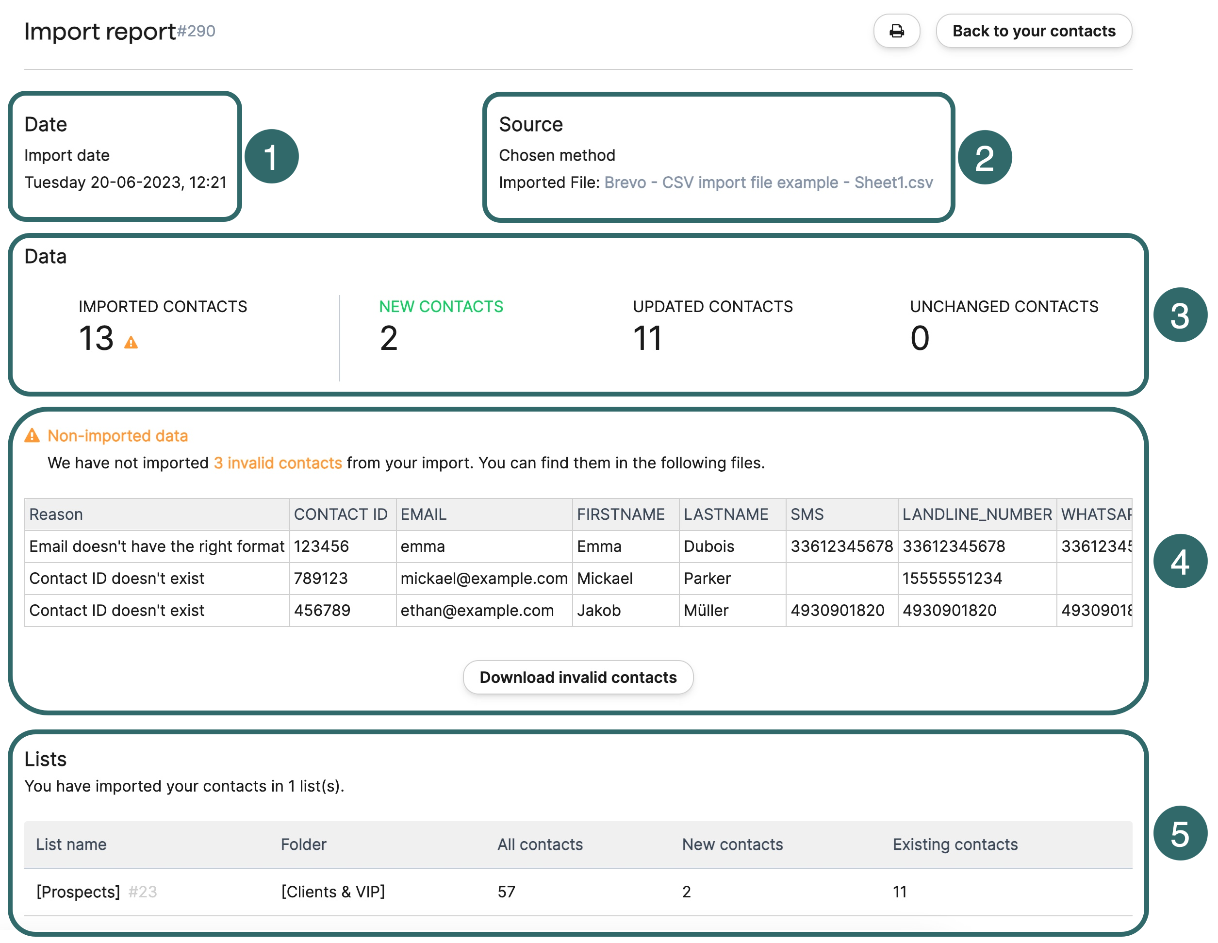 4. (Opcional) Mensajes de error si importa un ID de contacto que no existe o una dirección de email con un formato incorrecto. Puede descargar la tabla con los mensajes de error para corregir fácilmente sus datos antes de volver a importarlos.