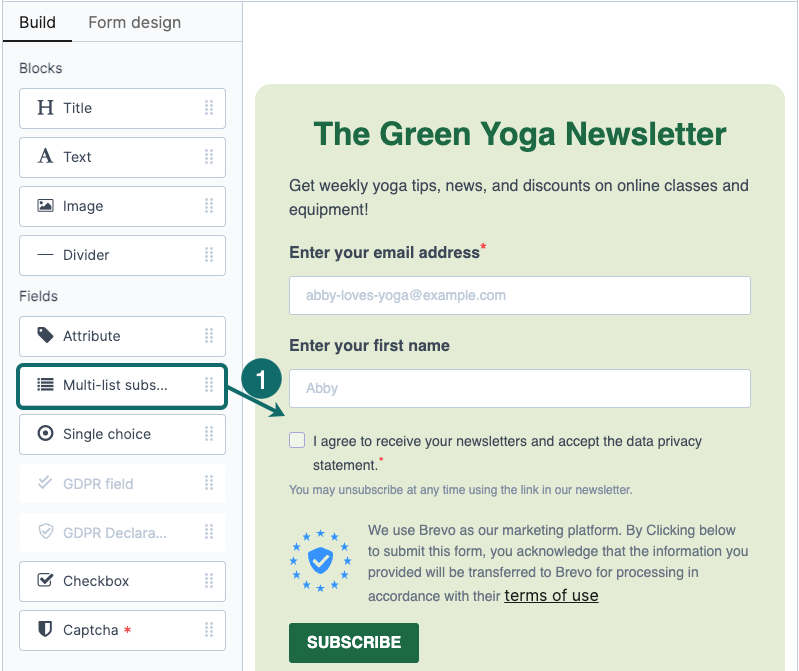En incluant un bloc d'inscriptions multi-liste dans vos formulaires d'inscription ou de mise à jour du profil standards, vous pouvez donner à vos contacts les moyens de personnaliser leur expérience en sélectionnant leurs centres d'intérêt et leurs préférences. Cela leur permet à leur tour de s'inscrire ou de se désinscrire facilement de listes spécifiques de Brevo en fonction de leurs préférences individuelles.