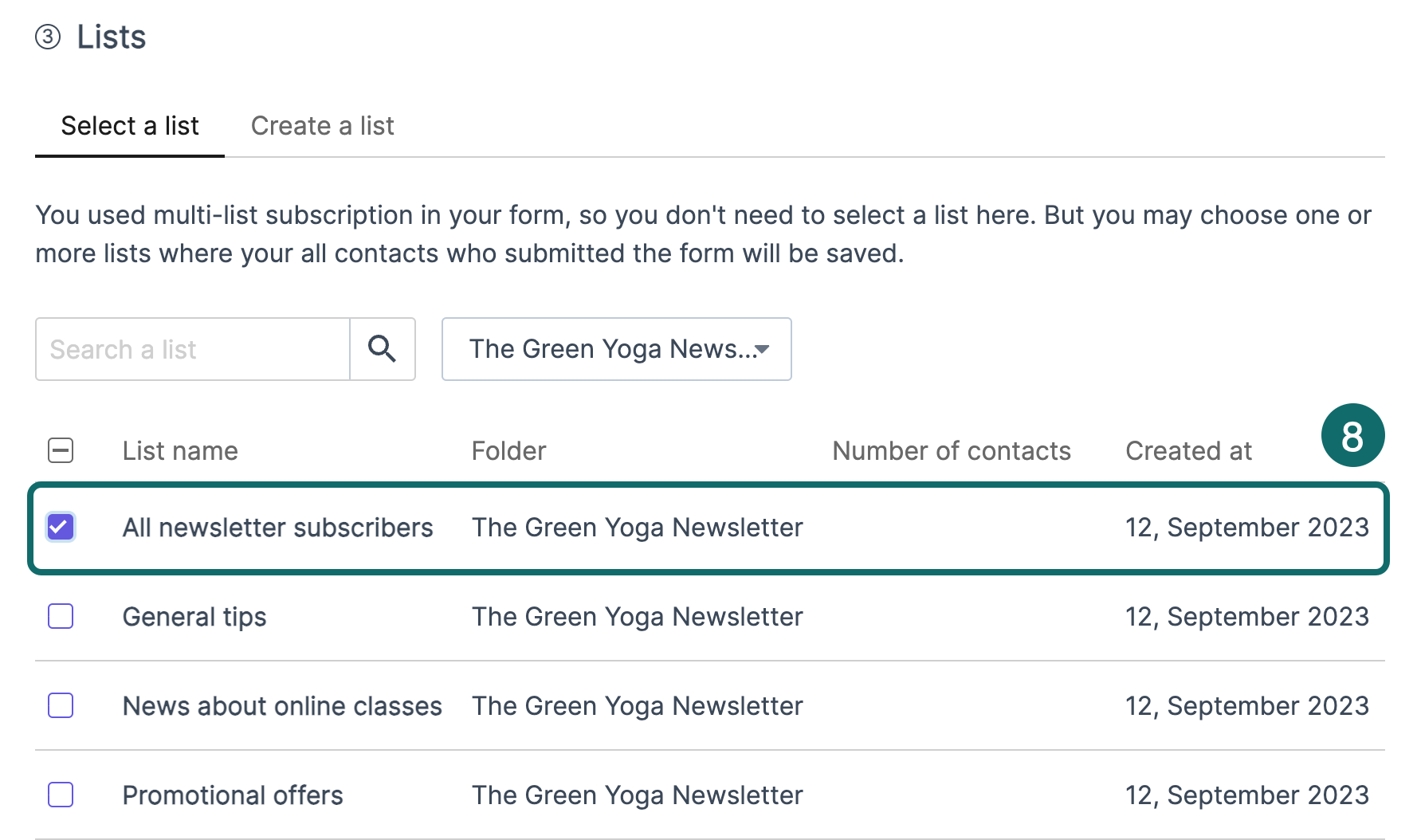 De plus, vous pouvez créer une liste de contacts « principale » à associer à votre formulaire. Dans l'exemple ci-dessous, nous avons créé une liste intitulée Tous les abonnés à la newsletter. Ainsi, tous les contacts qui rempliront votre formulaire seront également ajoutés à cette liste.
