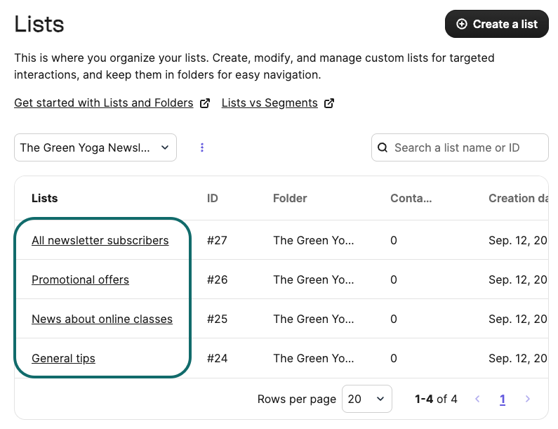Chaque centre d'intérêt ou préférence affiché dans votre formulaire correspond à une liste de contacts spécifique que vous avez créée dans Brevo. Dans l'exemple ci-dessous, nous avons créé trois listes pour une entreprise de yoga : Conseils généraux, Actualités des cours en ligne et Offres promotionnelles. Ainsi, lorsque les contacts choisissent les sujets qui les intéressent le plus ou qui ne les intéressent plus, ils sont ajoutés ou supprimés des listes correspondantes dans Brevo.