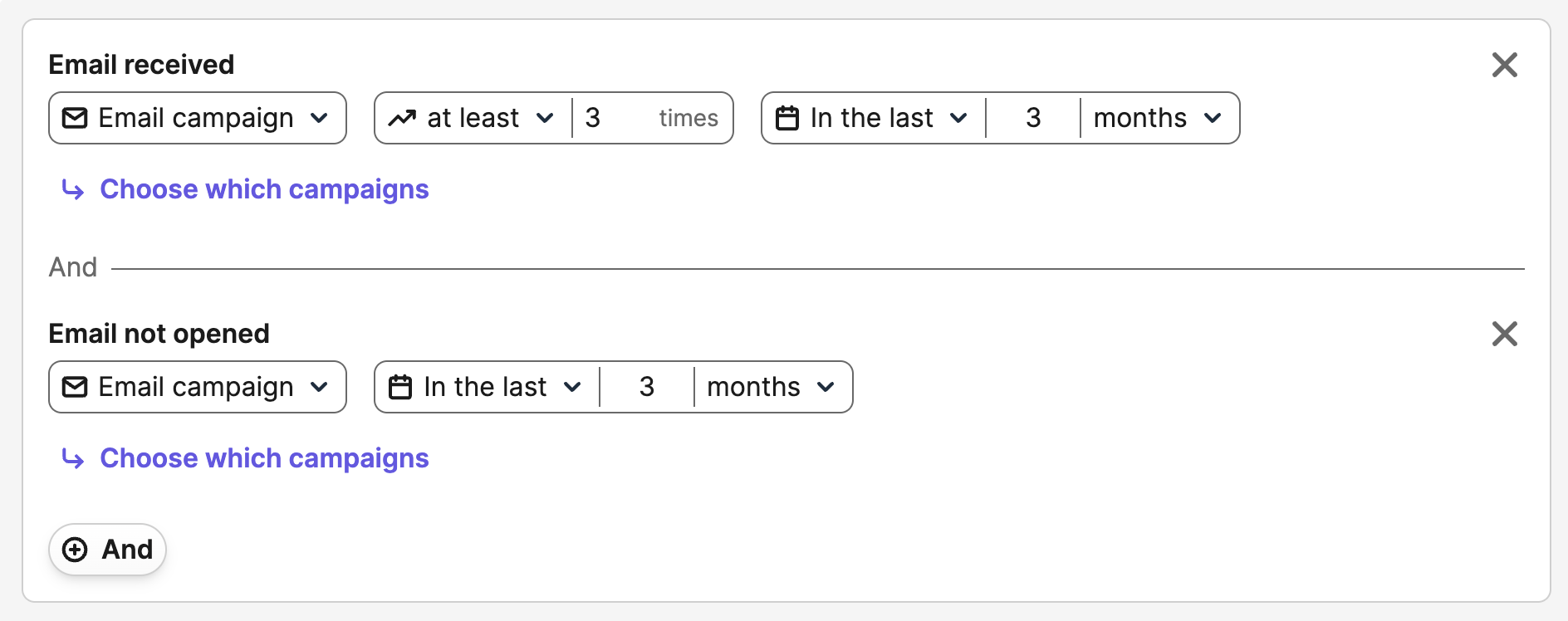 - Email > Email reçu > Campagne email > Au moins > 3 fois > Dans les derniers > 3 mois.