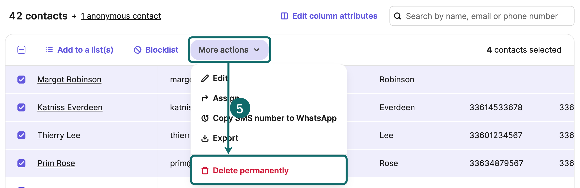 La suppression de contacts vous permet de les éliminer complètement et définitivement, tout comme leurs informations, de votre compte Brevo.