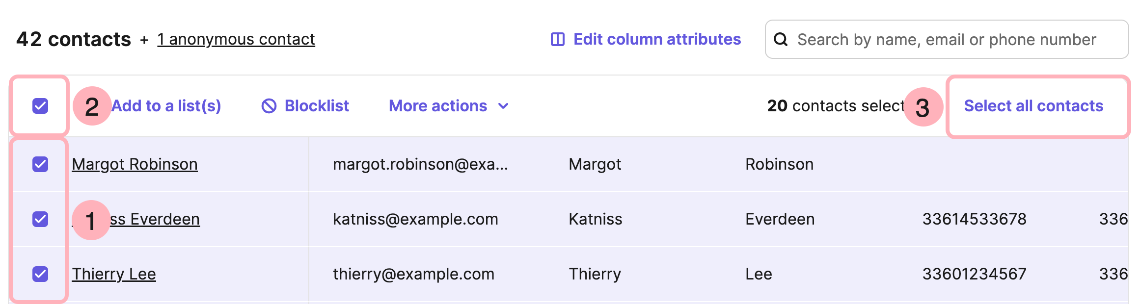 - Sélectionnez les contacts que vous souhaitez supprimer :