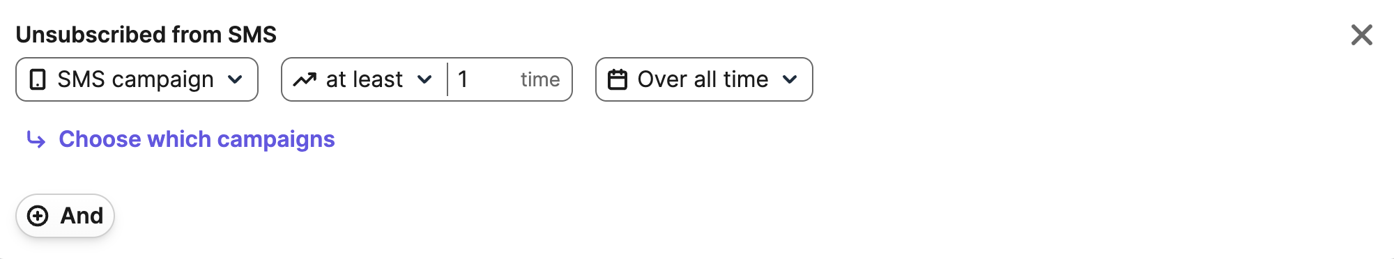 Dans le menu déroulant, sélectionnez SMS > Désinscription aux SMS > Campagne SMS. Vous pouvez ensuite spécifier le nombre de fois ou la période pendant laquelle ils se sont désinscrits, ainsi que des noms de campagne spécifiques.