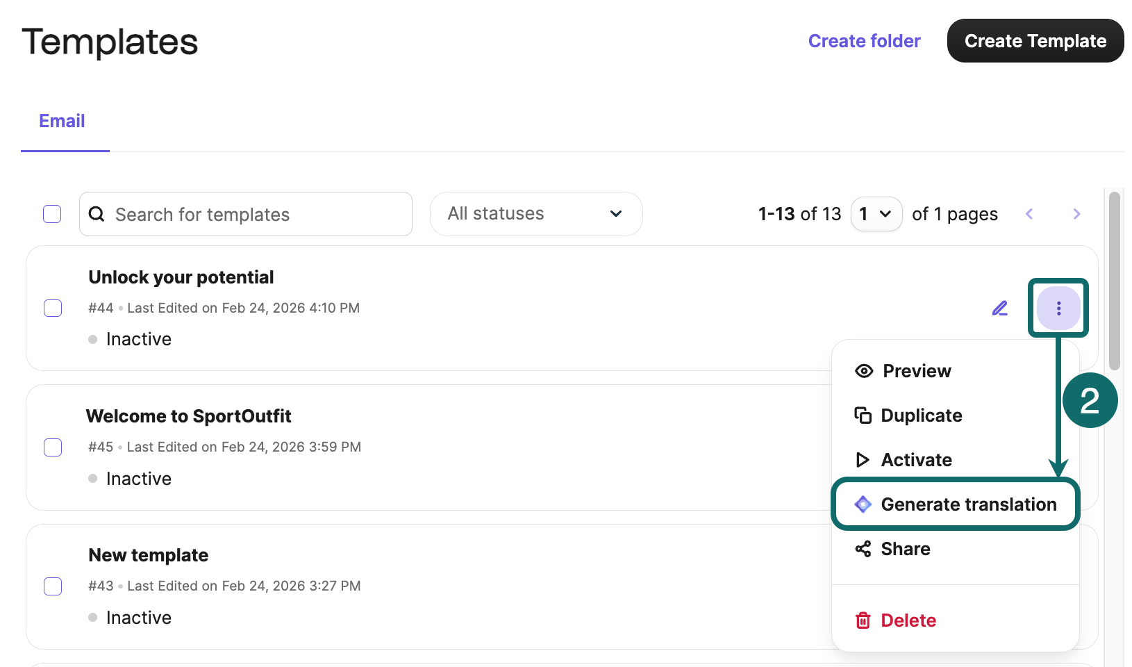 - Accanto al nome del modello di email che vuoi tradurre, clicca sull'icona con i tre puntini > Generate translations (Genera traduzioni). Si apre un pop-up.