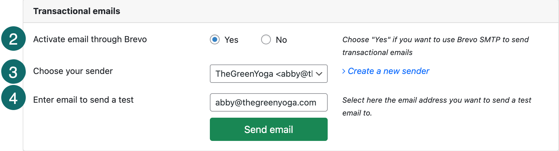 2. In Transactional emails (Email transazionali), seleziona Yes (Sì) per attivare l'invio di email tramite Brevo.