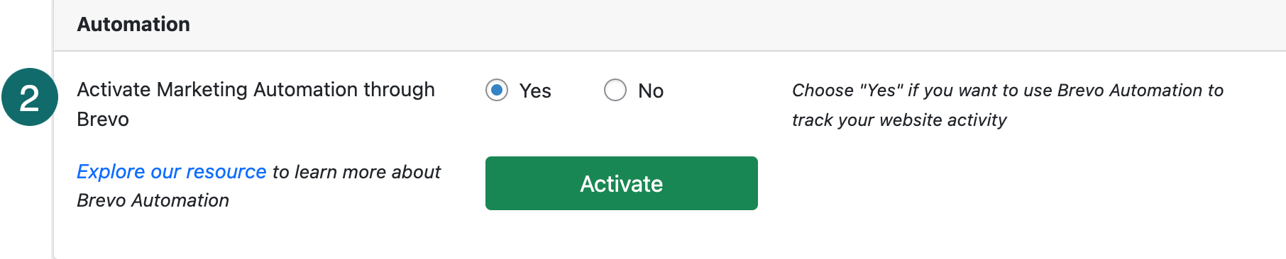 2. In Automation (Automazione), seleziona Yes (Sì) per attivare Marketing Automation tramite Brevo.
