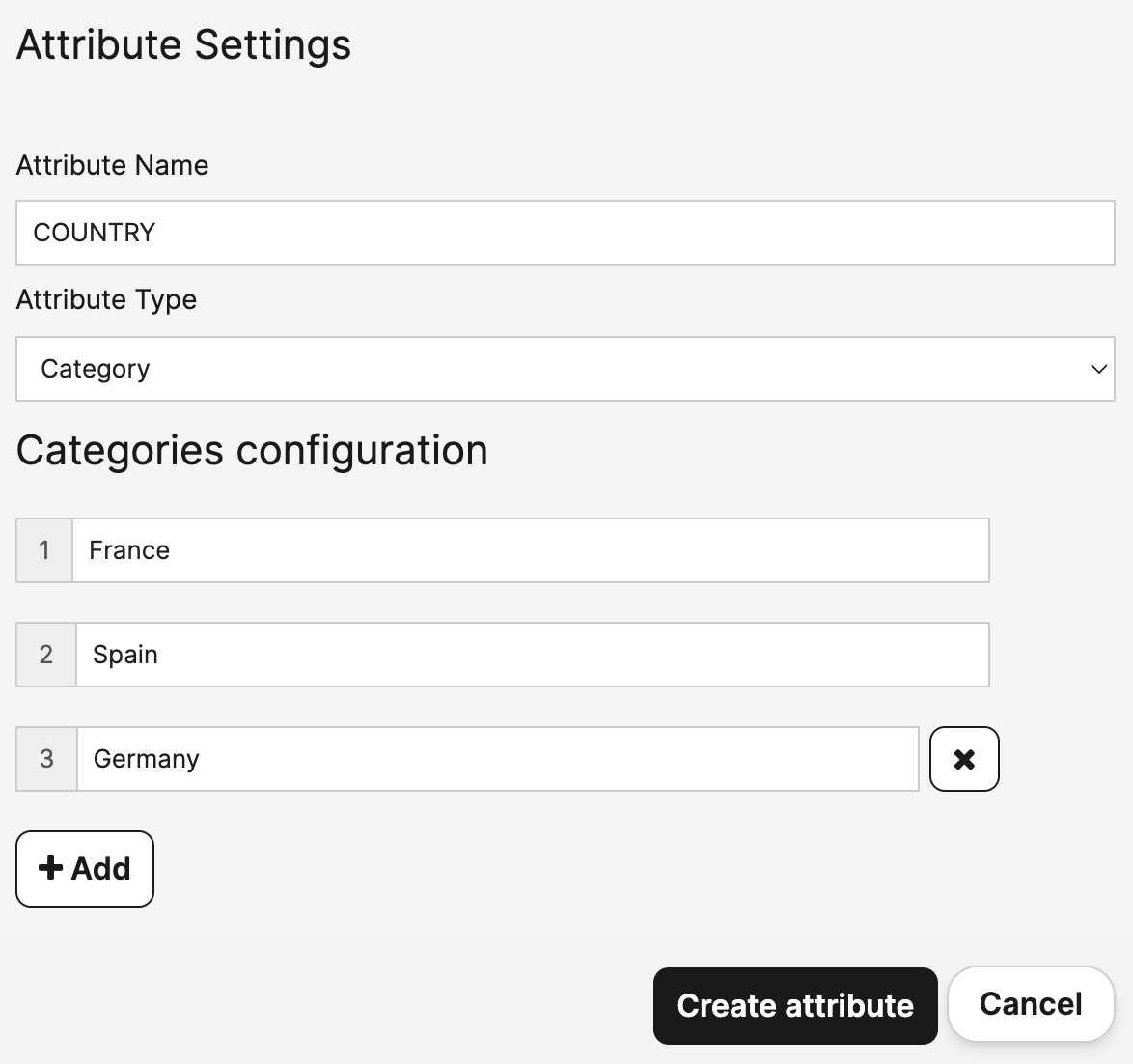 Por exemplo, se desejar armazenar informações sobre o país em que seus contatos moram, você poderá criar um atributo do tipo categoria chamado COUNTRY e definir os valores possíveis como "França", "Espanha", "Alemanha" etc. O atributo COUNTRY de cada contato conterá apenas um valor entre os que você especificou.