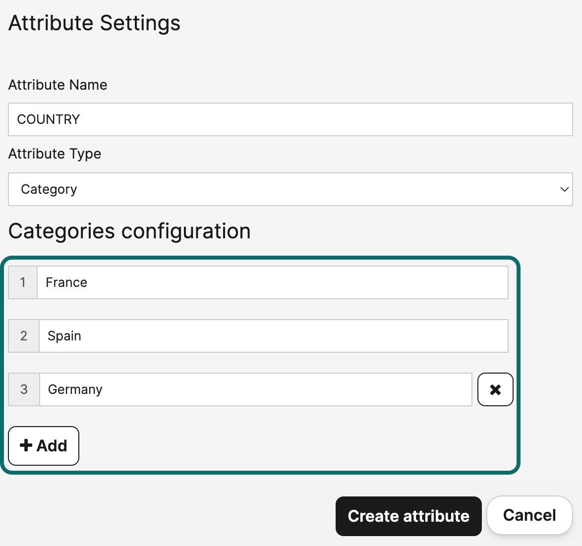 - (Opcional) Para os atributos de Categoria ou de Múltipla escolha, clique em + Add (+ Adicionar) e insira cada valor ao lado de um número.
